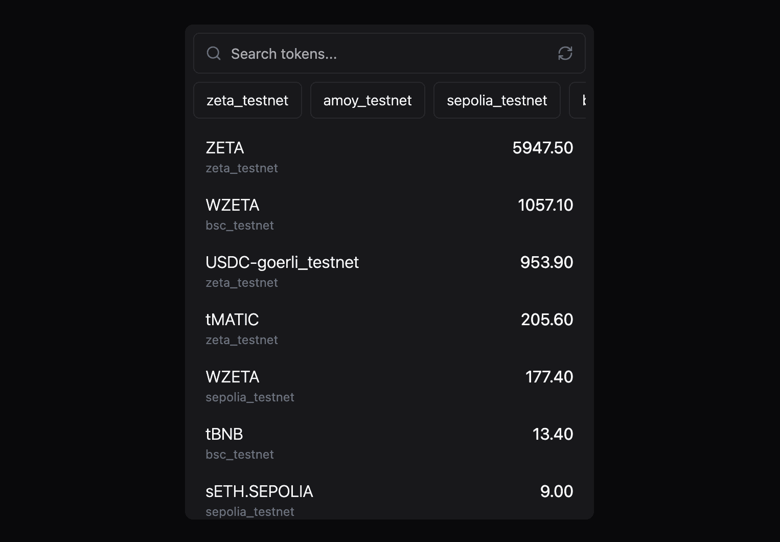 The Balances component provides a list of token balances on all chains connected to ZetaChain, with the ability to search the list and filter tokens by chain.
